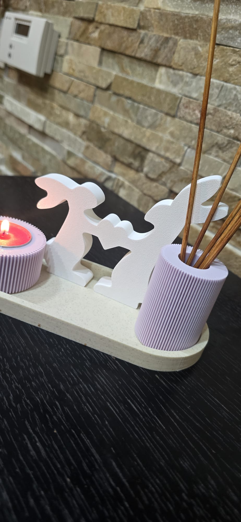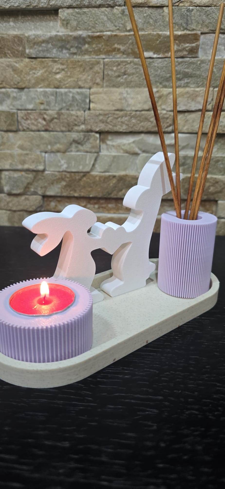 - Design: Apresenta uma base com dois coelhos brancos interligados, um porta-velas em textura vertical e um suporte para difusor de aromas ou outras decorações.