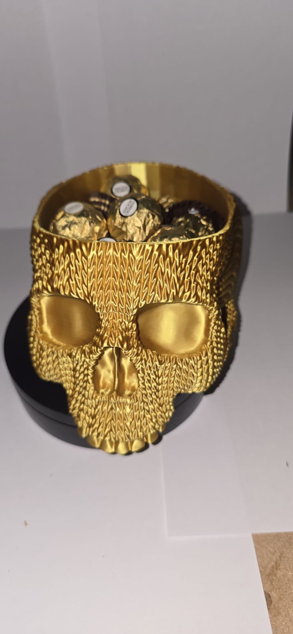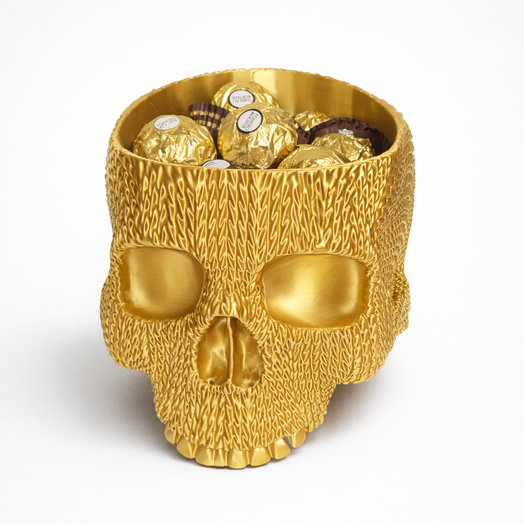 Transforme sua decoração com este incrível porta-objetos em formato de caveira. Com um acabamento dourado metálico e detalhes texturizados impressionantes, esta peça combina funcionalidade e estilo. Perfeito para armazenar doces, pequenos itens ou simplesmente destacar sua decoração com um toque ousado e moderno.