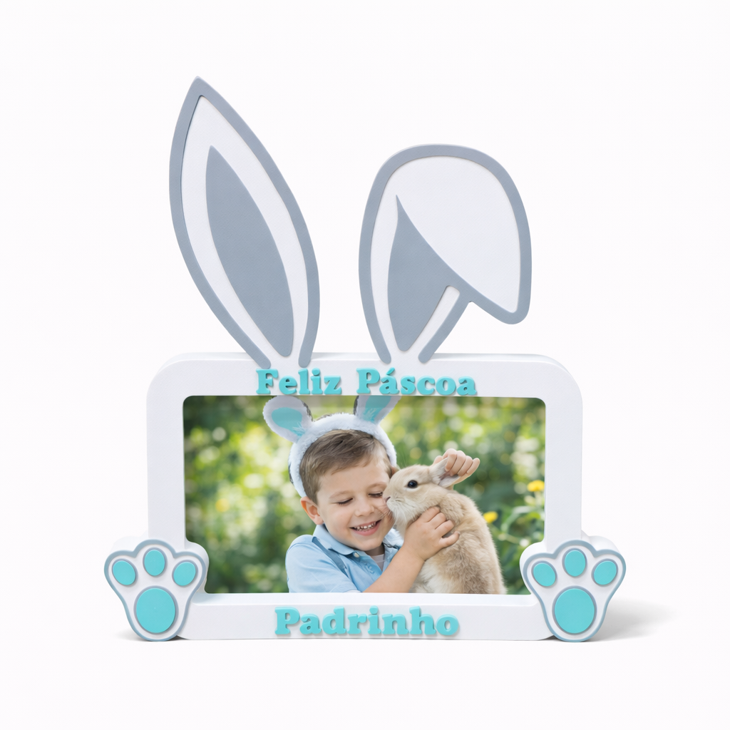 Celebre a Páscoa com um presente único e personalizado para os padrinhos do seu filho(a)! Este lindo porta-retrato em formato de coelho, impresso em 3D com material PLA biodegradável de alta qualidade, é perfeito para eternizar momentos especiais em família.